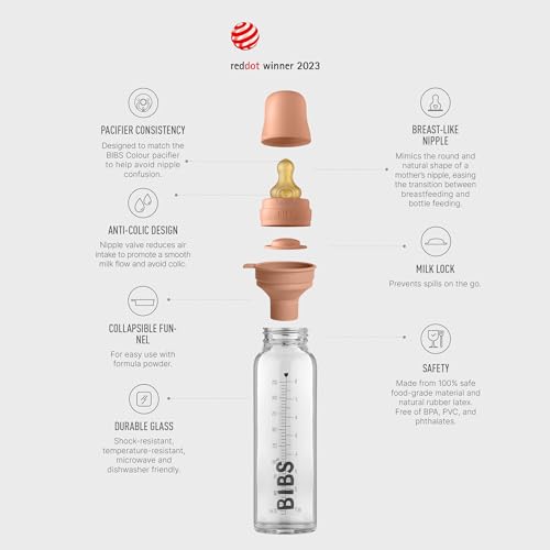 BIBS Baby Glass Bottle. Anti-colic. Round Natural Rubber Latex Nipple. Supports Natural Breastfeeding, 225 ml, Woodchuck