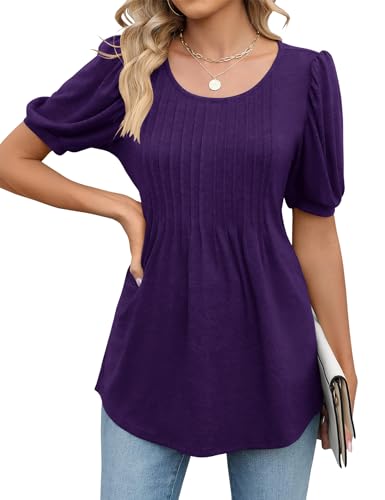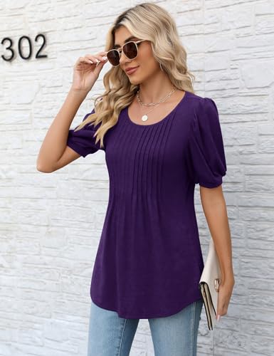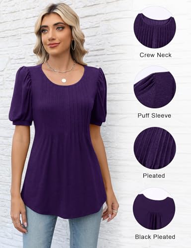iWoo Womens Puff Short Sleeve Shirts Crew Neck Pleated Tops Summer Fashion T-Shirt Dressy Casual Tunic Blouses