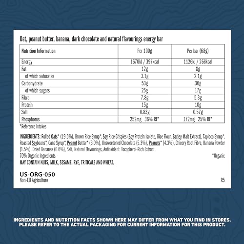 Rolled Oats* (19.6%), Brown Rice Syrup*, Soy Rice Crispies (Soy Protein Isolate, Rice Flour, Barley Malt Extract), Tapioca Syrup*, Roasted Soybeans*, Cane Syrup*, Peanut Butter* (6.0%), Unsweetened Chocolate (5.3%), Peanuts* (4.3%), Chicory Root Fibre, Banana Powder (1.5%), Dried Bananas (0.6%), Salt, Natural Flavourings, Antioxidant: Tocopherol-Rich Extract. 70% Organic Ingredients *Organic