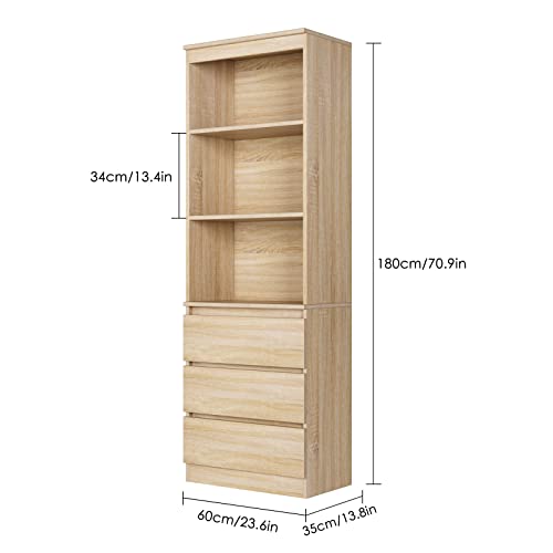 FirFurd 180cm Tall Bookcase Bookshelf with 3 Drawers and Shelves Living Room Storage Cabinet Freestanding Display Cupboard Unit Wooden Oak