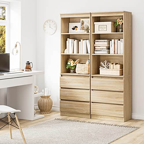 High-quality floor-standing bookshelf: The living room bookcase is made of specially selected wood panels with a smooth matt finish. The drawers are equipped with metal slides for smooth pulling and removal. The tall display cabinets have an anti-toppling device and are safe.
