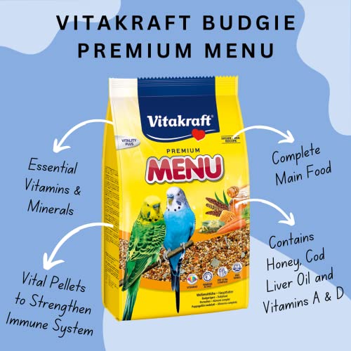 🦜 OPTIMAL NUTRITION IN EVERY BITE – Elevate your budgie food with the Vitakraft Premium Menu – a complete meal rich in honey, cod liver oil, essential vitamins A & D, and immune-boosting bird seeds. Your budgie and cockatiel deserve nothing but the best-balanced diet for peak health and longevity.