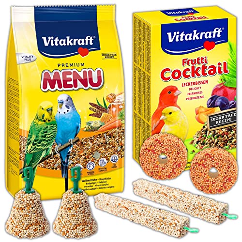 Budgie Food Bundle Containing 500g Vitakraft Premium Menu, 200g Fruit Cocktail & Johnsons Honey Budgie Treats Trio (Seed Bells, Bars, & Rings) Great Selection of Budgie Seed for Parakeets & Cockatiels