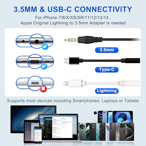 【3.5mm Jack/TYPE-C Connection】This 3.5mm wired headset with microphone includes a USB Type C to 3.5mm Headset Jack Adapter. Compatible with PC, Tablet, Mac, Laptop, iPhone Android Cell Phone, providing seamless connectivity with both 3.5mm and USB-C Jack. Friendly Note: For iPhone 7/8/X/XS/XR/11/12/13/14, Apple Original Lightning to 3.5mm Adapter is needed (Supplied by Apple).
