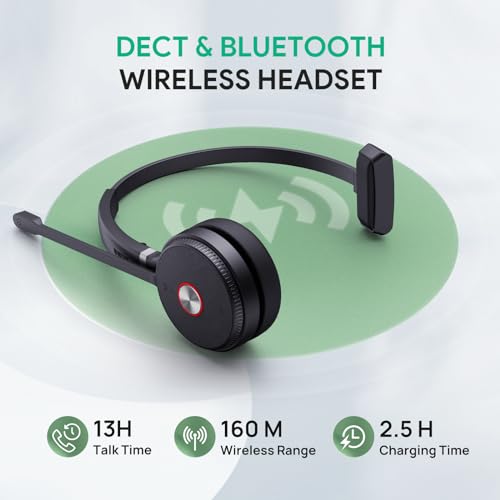 DECT TECH: DECT work headset allows you to enjoy a longer wireless distance of 160m/525 feet, higher density use, and safer calls. Talk time for a full workday: 13 hrs(mono) and 14 hrs(dual).